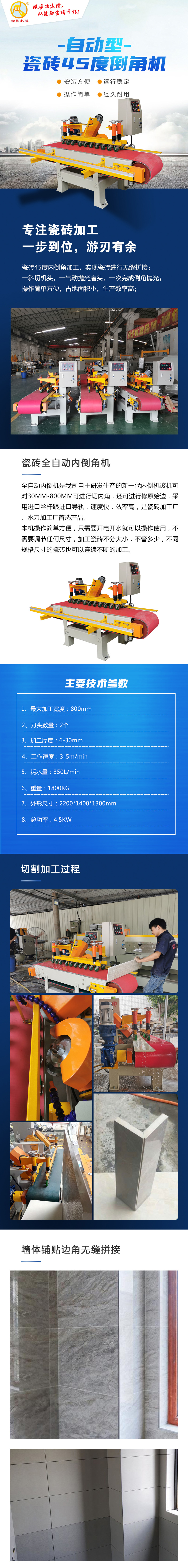 1200型瓷磚全自動(dòng)倒內(nèi)角機(jī),本機(jī)操作簡(jiǎn)單方便,只需要接電開水就可以操作使用,不需要調(diào)節(jié)任何尺寸,加工瓷磚不分大小,不管多少,不同規(guī)格尺寸的瓷磚也可以連續(xù)不斷的加工,速度快,效率高,耗電量低。瓷磚45度內(nèi)倒角加工,一般都用在墻轉(zhuǎn)角處兩塊倒過(guò)角的瓷磚進(jìn)行拼接。適用范圍:非常適合瓷磚加工廠,以及工程工地上使,配合全自動(dòng)三刀數(shù)控切割機(jī),切割+內(nèi)外倒角。