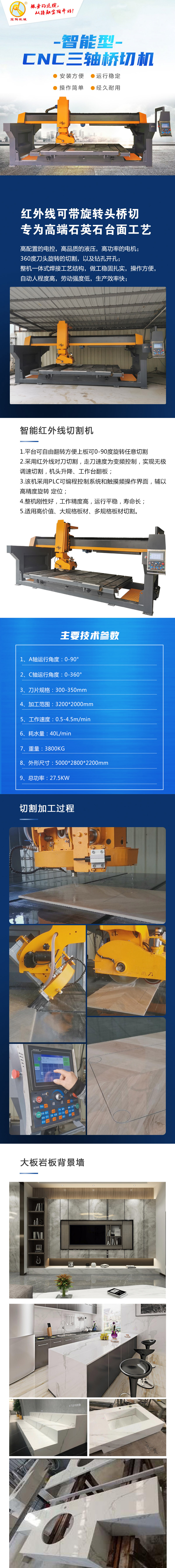 多功能3軸橋式切割機(jī),可切斜角、直線、切割盆孔、鉆孔等臺(tái)面加工的多個(gè)工藝,一臺(tái)機(jī)器全部完成,該機(jī)還具備吸板、拍照等功能。實(shí)現(xiàn)了臺(tái)面板一體化加工,從橋切切板、成型、開(kāi)臺(tái)盆孔、鉆孔、打磨拋光全部工序加工都完成,實(shí)現(xiàn)了臺(tái)面板加工的機(jī)械化、自動(dòng)化。臺(tái)面板加工中心,既可以切割不同厚度石材板材,又可以完成臺(tái)面板的鉆孔、邊的成型、打磨拋光等工作,生產(chǎn)效率高、產(chǎn)品質(zhì)量好。解決了臺(tái)面板人工打磨拋光的難題,實(shí)現(xiàn)了機(jī)械打磨拋光,使石材臺(tái)面板的加工工藝實(shí)現(xiàn)了革命性的突破,大大提高了臺(tái)面板的生產(chǎn)效率,產(chǎn)品質(zhì)量,了降低了打磨拋光員